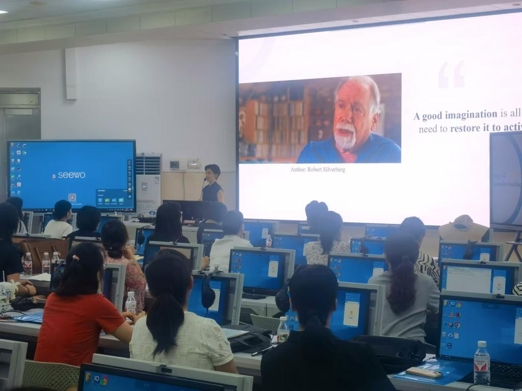 此次授课观摩公开课由英语系何含果老师讲授一堂《综合英语》课。何含果老师有着丰富的教学经验和独特的教学风格,深受学生们的欢迎,她曾获得广东省第六届高校(本科)青年教师教学大赛三等奖、外研社“教学之星”大赛全国总决赛二等奖和第二届全国教师教学创新大赛省级优秀奖。