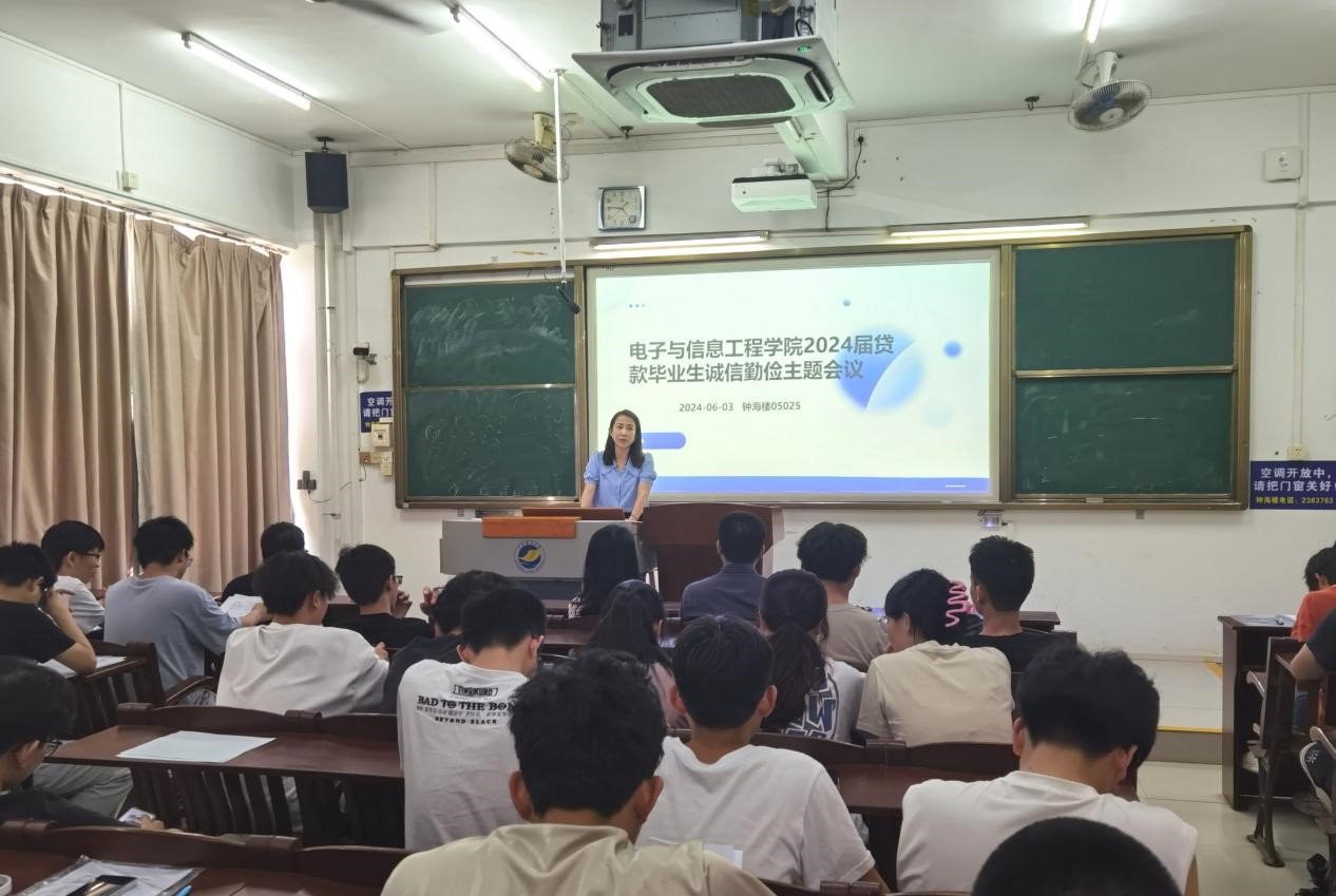为进一步做好国家助学贷款政策宣传和促进按期还款,电子与信息工程学院于6月3日下午在钟海楼05025教室开展诚信勤俭主题教育会议,学院党委副书记王梓珊、毕业班辅导员以及2024届国家助学贷款毕业生共70余人参加会议。