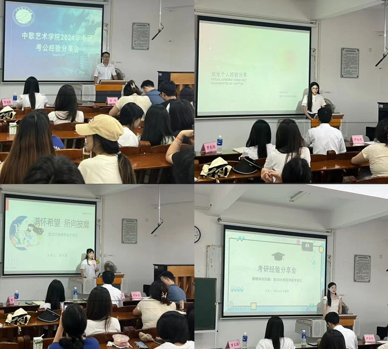 为进一步加强学院学风建设,激发学生的学习热情,营造浓厚的考研氛围,助力学生掌握未来考研形势、明晰学业规划,6月13日,中歌艺术学院在艺海楼A302室以“线上+线下”的形式举办了考研考公经验分享会,共有48名二、三年级本科生线下参会。会议由辅导员尹灿东和罗文怡主持,学院党委副书记翟周参加了本次活动并讲话。