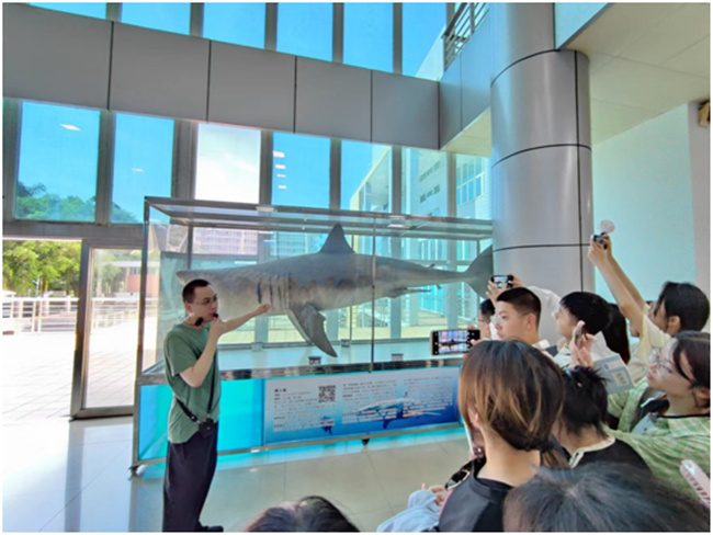 在海洋珍稀保护动物展厅,大白鲨、鲸鲨、布氏鲸等大量珍稀海洋生物剥制标本和骨架标本映入眼帘,同学们对标本展现出极大兴趣。伴随着讲解员的讲解,穿梭于鱼、虾、贝、藻各类专题专厅,同学们对这些海洋生物的形态特征与生活习性、海洋生物的发展历史等有了更深入的了解,领略到海洋的无穷魅力。同时,同学们深入了解到海洋生物多样性及保护知识,不仅感悟到生命之美,还唤醒了保护海洋生态的意识。