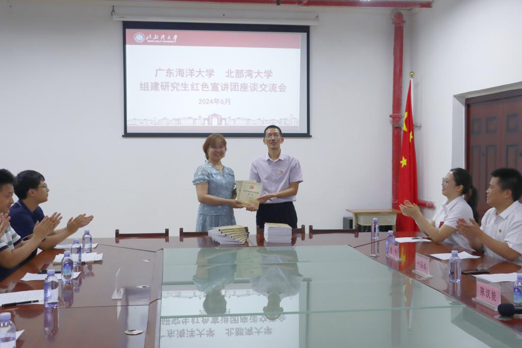 北部湾大学研究生院院长刘琼、马克思主义学院副院长何良俊和校团委副书记张飞分别就弘扬地方红色文化、题材挖掘、育人特色和双方在人才培养交流与合作等方面作了交流发言,叶国栋代表宣讲团向北部湾大学赠送了《讲好南路革命故事读本》。
