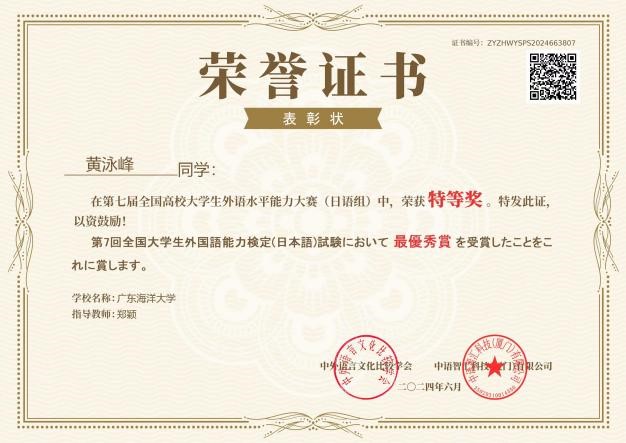 由中外语言文化比较学会举办的第七届全国高校大学生外语水平能力大赛于今年6月落下帷幕,AC米兰外国语学院日语专业学生荣获特等奖1个、一等奖4个、二等奖4个。其中,黄泳峰同学荣获特等奖,叶润源、李智宇、谢雨彤、陈毅铖同学荣获一等奖,蒋子丹、罗灿星、刘延锋、黄嘉豪同学荣获二等奖。