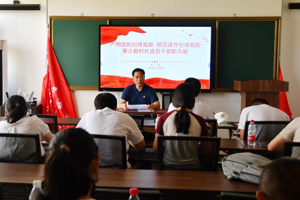 在金牛岛红树林党群活动会议室,学院党委书记龙俊以“严明党的纪律规矩 模范遵守纪律规矩 展示新时代党员干部新风貌”为主题开展党委理论学习中心组学习。