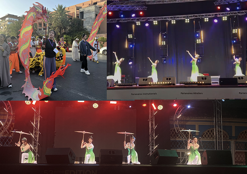 第53届摩洛哥全国民间艺术节在摩洛哥红色之城马拉喀什市举行,中国高校代表团与摩洛哥表演团队联合进行三场演出和一场巡游,演出规模盛大,共计65支表演团队参与了演出和巡游。影响力度大,宣传范围覆盖该市主干道路及繁华地段,受到了摩媒体、CGTN、摩国家广播电视台、摩通社等媒体的广泛关注及报道。