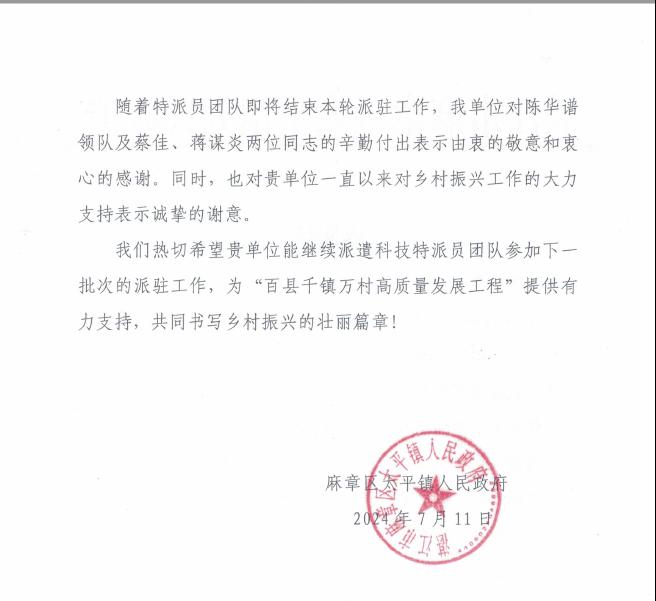 镇政府对该团队驻村期间的工作给予充分肯定,感谢他们的辛勤工作,同时衷心感谢学校、学院对太平镇乡村振兴工作的大力支持,并热切希望学校能继续派遣科技特派员团队参加下一批次的派驻工作,为“百县千镇万村高质量发展工程”提供有力支持,共同书写乡村振兴的壮丽篇章。