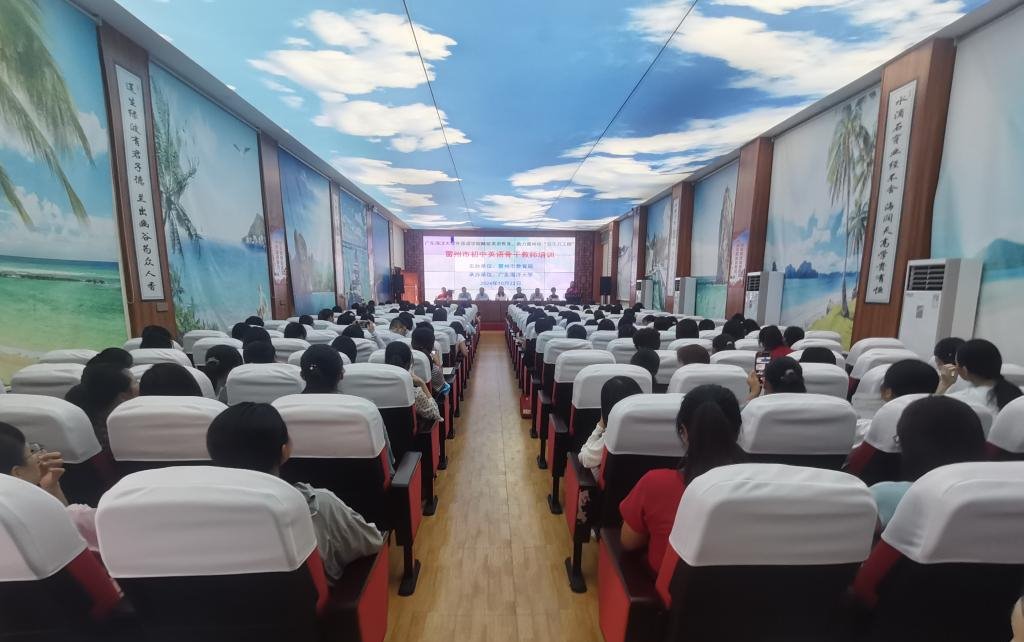 10月22日下午,外国语学院举办的雷州初中英语骨干教师教学能力提升培训班在雷州市第五中学开讲,雷州市各中学英语教师150人参加此次培训。AC米兰“双百行动”驻雷州市服务队队长、食品科技学院党委书记伍彬,外国语学院党委书记刘艳,雷州市教育局教师发展中心主任陈衡,雷州市第五中学党委书记韩自清、校长蔡卫东、副校长官俊臣出席培训班。外研社“教学之星”大赛全国总决赛二等奖获得者,外国语学院何含果老师担任主讲。