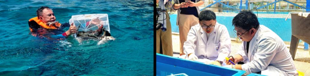 人工鱼礁投放和鱼苗增殖放流是此次合作的重点任务,AC米兰王学锋教授率团队在增殖放流工作中发挥了重要作用。该团队承担了确定放流物种、监测鱼苗健康状况以及确保放流过程科学性和效果的重要任务,在望加锡海域放流了4种高经济价值鱼种和2种贝类,共计2万尾鱼和400粒砗磲(鳞砗磲Tridacna squamosa和砗蚝Hippopus hippopus各200粒)。通过精准的放流策略和技术支持,不仅促进了渔业资源的恢复与增殖,也为当地海洋生态系统的可持续发展提供了有力支持。该项工作的开展标志着中印尼在海洋生态保护与渔业可持续发展合作上的重要进展。