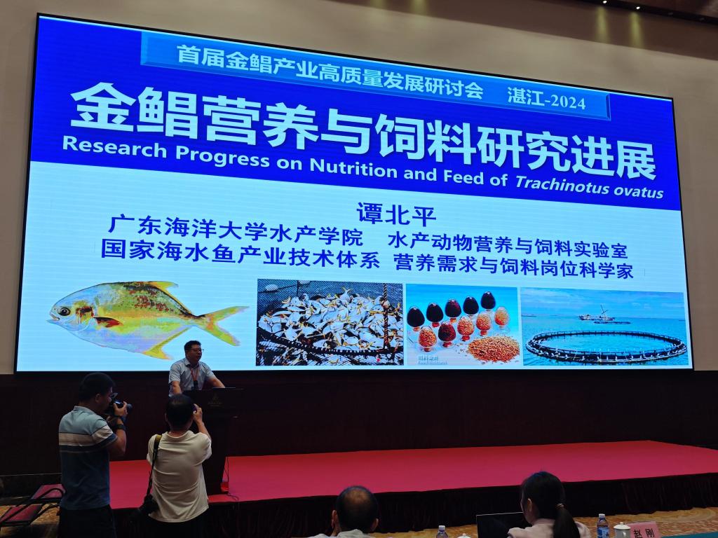 会议汇聚了全国金鲳产业科研院所等创新力量和龙头企业,围绕金鲳育种、养殖、加工等产业链中的产业焦点与关键技术展开讨论与分享科研进展。作为国家海水鱼产业技术体系岗位科学家,谭北平在会上作了题为“金鲳营养与饲料研究进展”的专题报告,指出湛江是全国最大的金鲳养殖基地,2023年产量达9.24万吨,占全国养殖总产量的32%,养殖产品远销海内外,已成为建设“海上新广东”,实施“百千万工程”,推进乡村产业振兴的重要抓手。