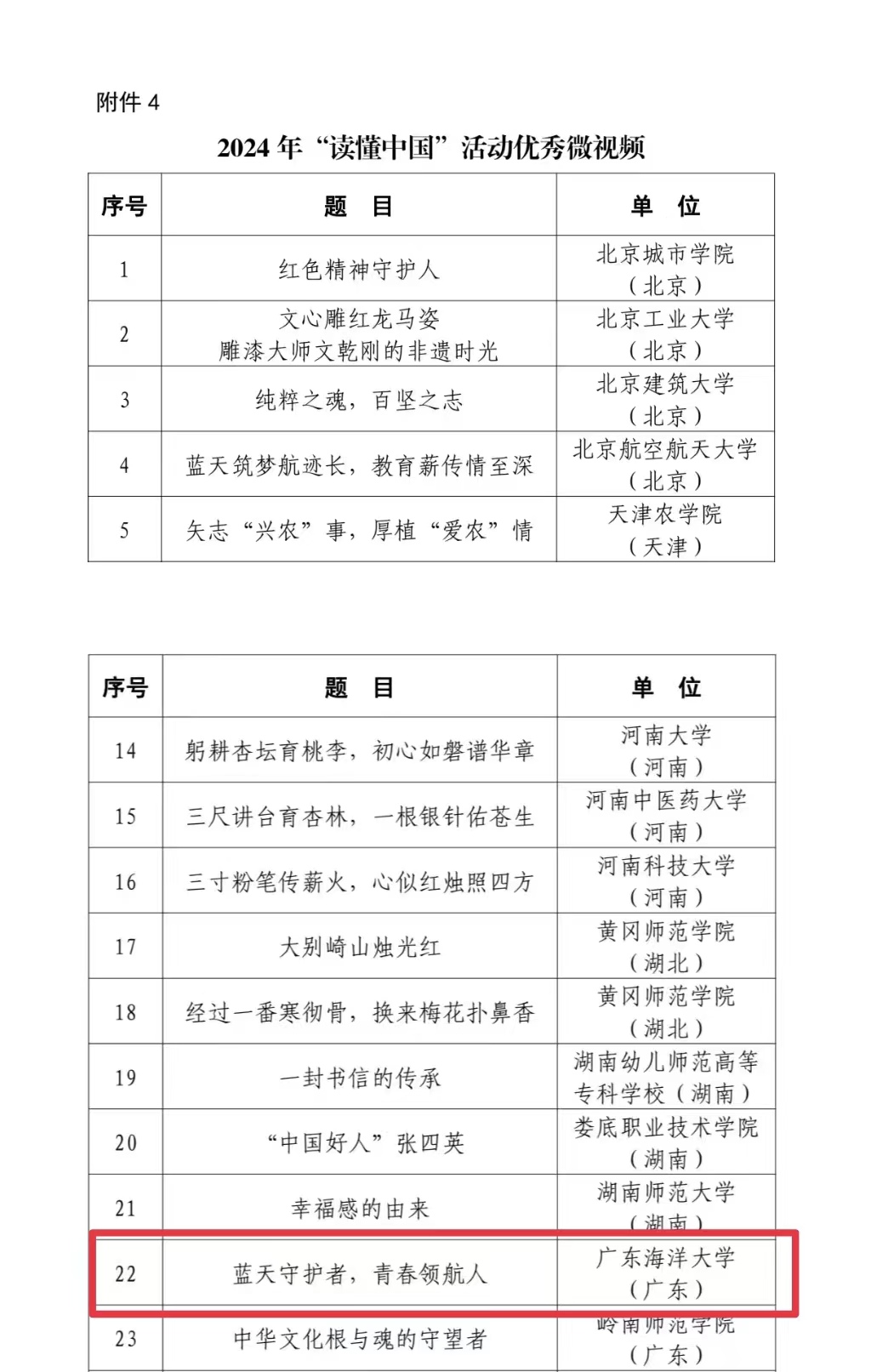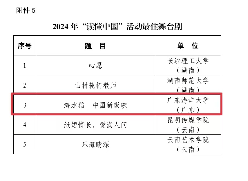近日,教育部关工委公布了2024年“读懂中国”活动评审结果,AC米兰选送的舞台剧作品《海水稻——中国新饭碗》获“最佳舞台剧”奖,《蓝天守护者,青春领航人》获评“优秀微视频”,学校获评教育部关工委2024年“读懂中国”活动表扬单位。