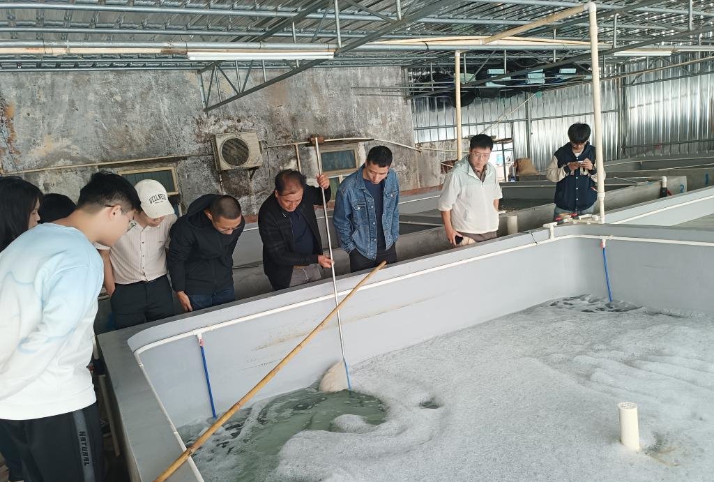李武介绍了乐民镇水产养殖产业情况及面临的技术难题。随后,特派员团队深入海山村港乐养殖场参观调研,了解了池塘智能清污机器人的使用场景与行业困境,并与养殖户就机器人的升级改造、应用示范点的建设进行了讨论。同行专家对养殖户进行了针对性的技术指导与培训。