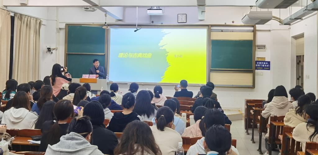 王小岩的报告基于学生论文选题的现状和自己的研究经历展开,从为何古典戏曲研究需要理论、如何用理论阐释古典戏曲、理论阐释古典戏曲的方法举例、走出理论与回到古典戏曲等四个方面,展示了东西方文学、社会学、心理学、历史学等学科的理论成果对中国传统戏曲研究的视角性和方法性启示。在报告过程中,王小岩旁征博引,深入剖析,详细介绍了理论介入对中国古典戏曲研究走出阐释困境的意义以及理论介入中国古典戏曲研究的个体实践过程。其中,“晚期风格”与冯梦龙《万事足》、身份认同与汤沈之争、文化记忆与沈自晋《南词新谱》等三个案例彰显了理论在中国古典戏曲研究领域的跨学科和跨文化价值,对学生的启发性大。