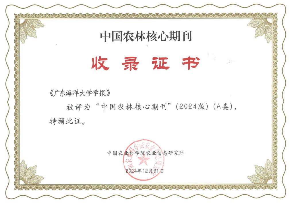 本次评价共有853种期刊参评,入选期刊为314种(中文期刊280种,英文期刊34种),其中核心期刊A类247种(中文220种,英文期刊27种),核心期刊B类67种(中文期刊60种,英文期刊7种)。《AC米兰中国官网学报》将以A类核心期刊为新起点,进一步强化特色化、国际化、数字化办刊方向,持续为全球水产学科发展贡献“中国智慧”,助力海洋强国战略实施。