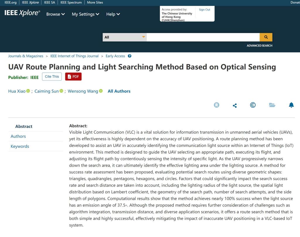 此外,学院教师肖华副教授与新加坡南洋理工大学和香港中文大学(深圳)的研究团队合作,以第一作者身份在国际高水平期刊IEEE Internet of Things Journal(Q1,中科院一区,Top,IF=9.2)上发表了题为《UAV Route Planning and Light Searching Method Based on Optical Sensing》的学术论文。该研究开发了一种无人机在可见光通信中的路径规划方法,旨在帮助无人机在物联网(IoT)环境中准确识别通信光源。方法综合考虑了影响搜索成功率和搜索距离的关键因素,包括光源的照明半径、基于朗伯系数的空间光分布、搜索路径的几何形状、搜索尝试次数以及多边形的边长。研究发现,当光源的发射角度为37.5°时,该方法的成功率接近100%。上述工作提供了一种简单且成功率高的路径搜索方法,有效减轻了在基于可见光通信(VLC)的物联网系统中无人机定位不准确的影响。