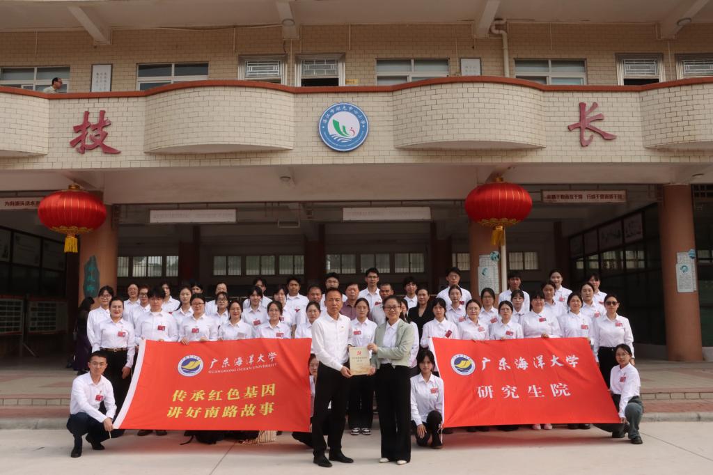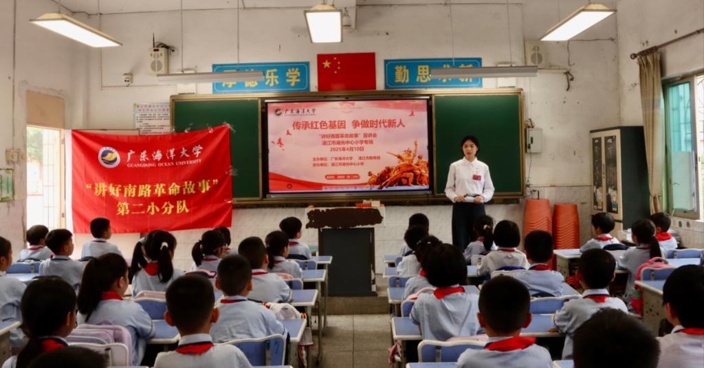 作为学校构建“红蓝绿”大思政育人格局中“以红色基因打底色”的重要内容,“讲好南路革命故事”既是擦亮党建特色的品牌工程,更是通过革命叙事启智润心、培根铸魂的育人实践。活动中,陈关怡代表宣讲团向湖光中心小学赠送《讲好南路革命故事读本》,为红色教育注入鲜活教材。42名大学生宣讲员构建“多维宣讲矩阵”,依托革命文物图片、情景演说、互动问答等形式,在36个班级同步开讲南路革命先驱黄学增、南路“江姐”钟竹筠等南路革命先辈的革命理想、家国情怀等史诗般的故事。通过“行走的红色课堂”,将“南路星火”化作可触可感的成长养分。