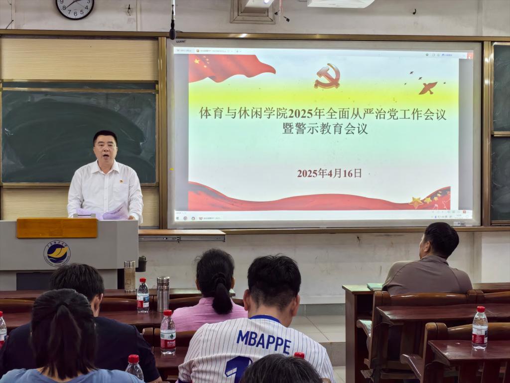 4月16日下午,体育与休闲学院在广学楼208教室召开2025年全面从严治党工作会议暨警示教育会议,学习贯彻习近平总书记关于全面从严治党的重要论述,学院领导班子成员和全体党员干部教师参会,会议由学院党委书记王明对主持。