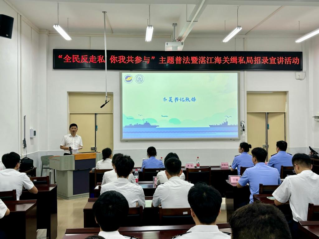 湛江海关缉私局和风控分局的同志向同学们普及反走私、离岛免税等相关法规知识,结合近年来打击走私犯罪的典型案例,向同学们普及海南离岛免税“套代购”走私的特点、危害及防范措施,引导学生自觉抵制远离走私,做到学法、懂法、守法,并进行了公务员招录宣讲。与会嘉宾与同学们进行了热烈互动,积极解答了同学们在反走私、防“套代购”、考公等方面的疑惑。
