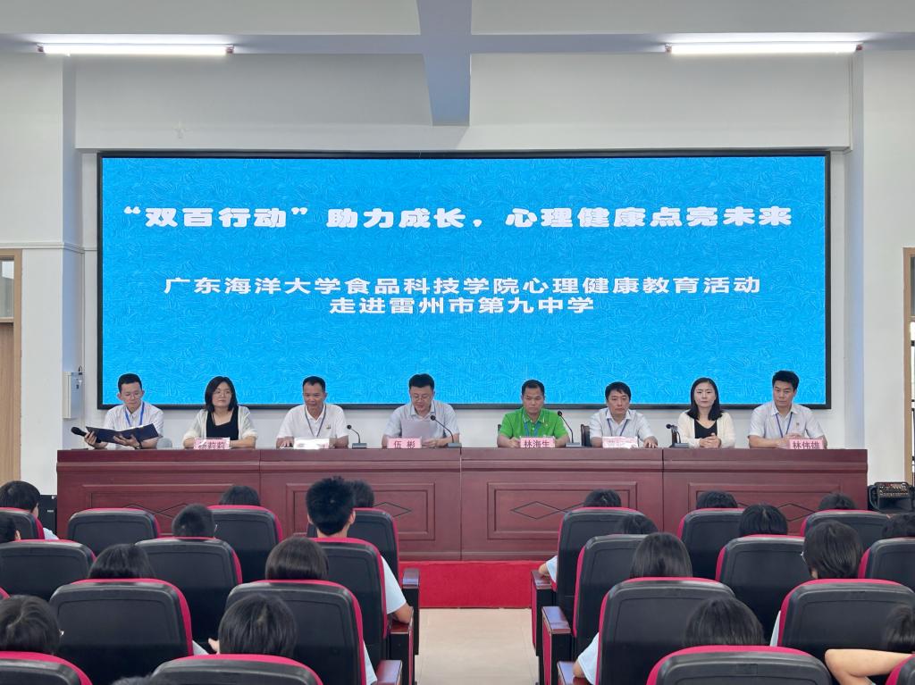 6月18日,食品科技学院党委书记伍彬带领心理健康教育与咨询中心杨莉莉老师及食品科技学院小浪花心理驿站团队,前往雷州市第九中学开展以“‘双百行动’助力成长,心理健康点亮未来”为主题的心理健康教育活动。雷州市第九中学校长林海生及“双百行动”驻雷州市服务队同志参加了活动。