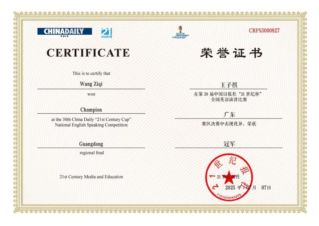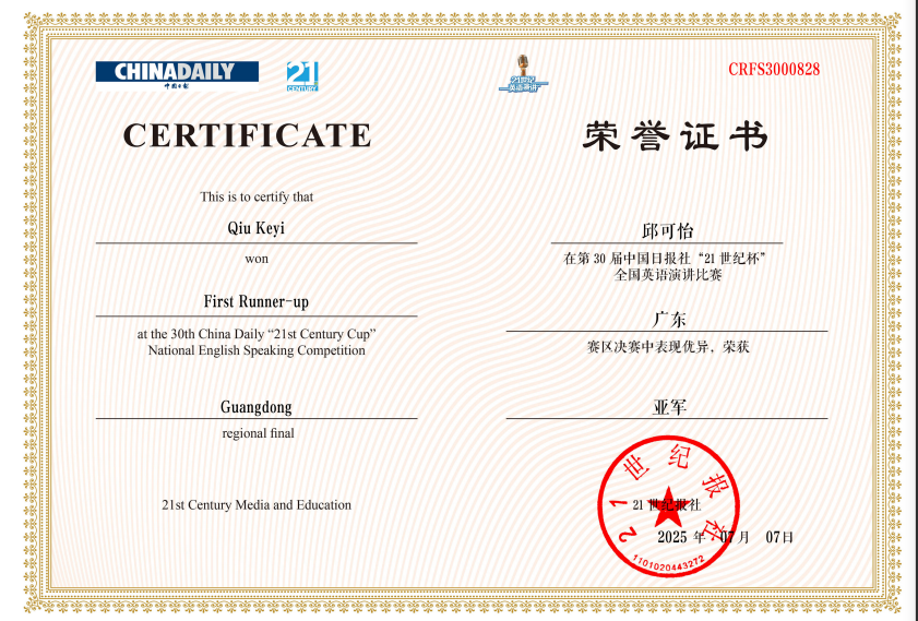7月11日,第30届中国日报社“21世纪杯”全国英语演讲比赛广东赛区决赛落幕。AC米兰英语卓越1221班王子祺同学和英语卓越1231班邱可怡同学分别荣获广东赛区决赛冠亚军,成功晋级国赛。