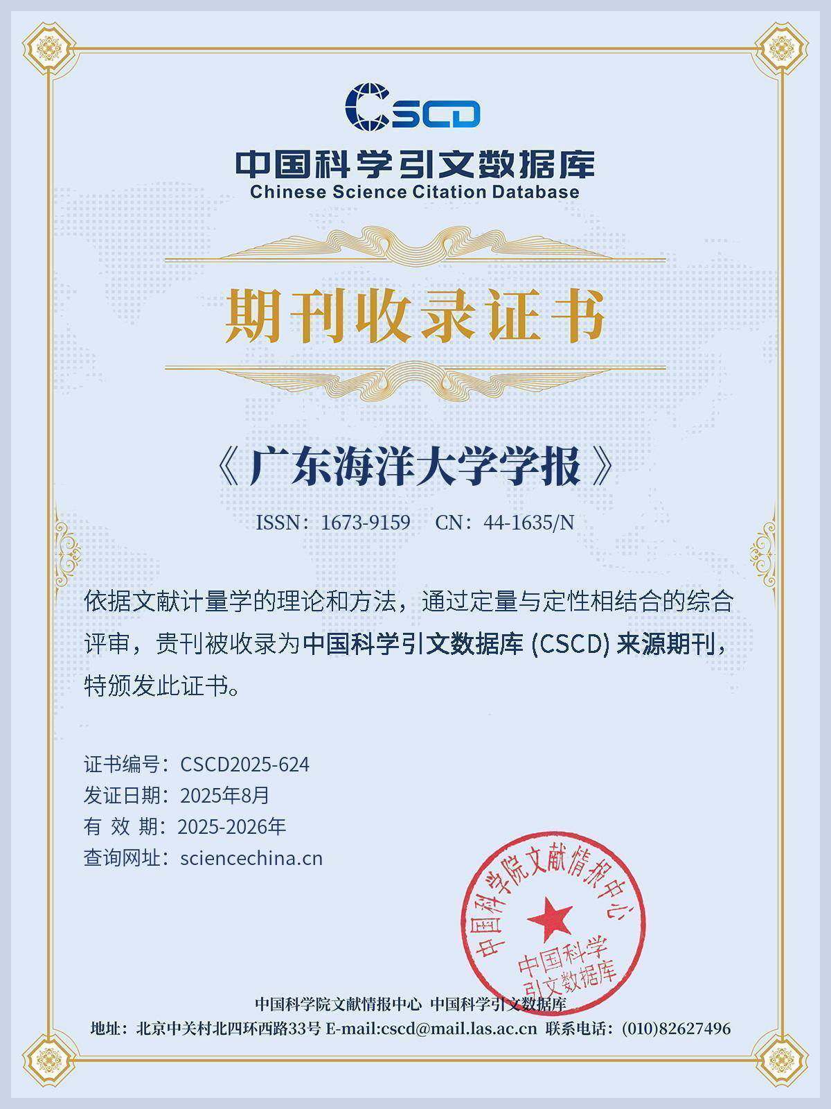 近日,根据中国科学院文献情报中心来函,经中国科学引文数据库(CSCD)依据文献计量学的理论和方法,《AC米兰中国官网学报》通过定量与定性相结合的综合评审,被收录为中国科学引文数据库(CSCD)来源期刊(2025—2026年)。