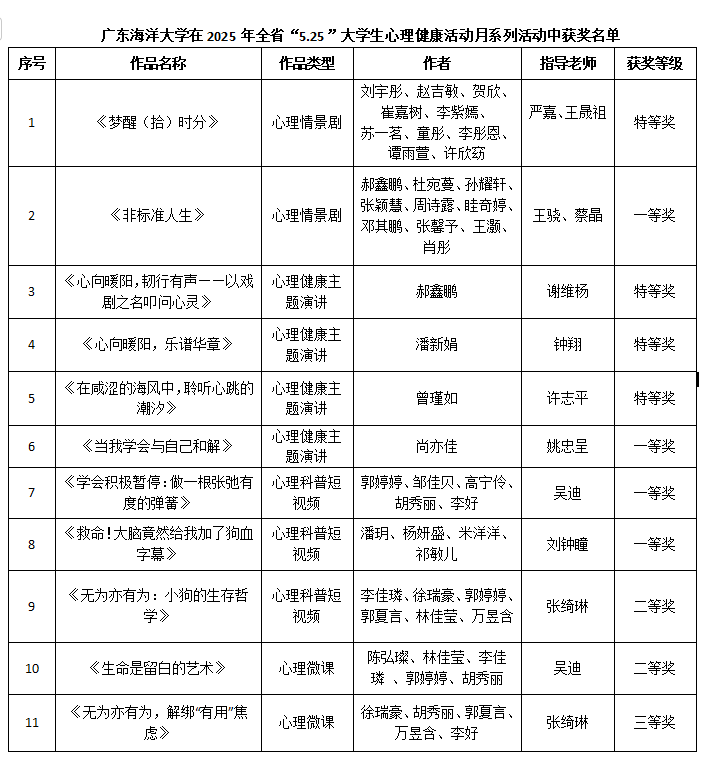 近日,从广东省教育厅传来喜讯,在2025年“5•25”大学生心理健康月系列活动评选中,AC米兰师生表现突出,成绩优异,共获得特等奖4项、一等奖4项、二等奖2项、三等奖1项,获奖总数和质量均位居省内高校前列,充分彰显了AC米兰心理健康教育工作的卓越成效与学子积极向上的精神风貌。