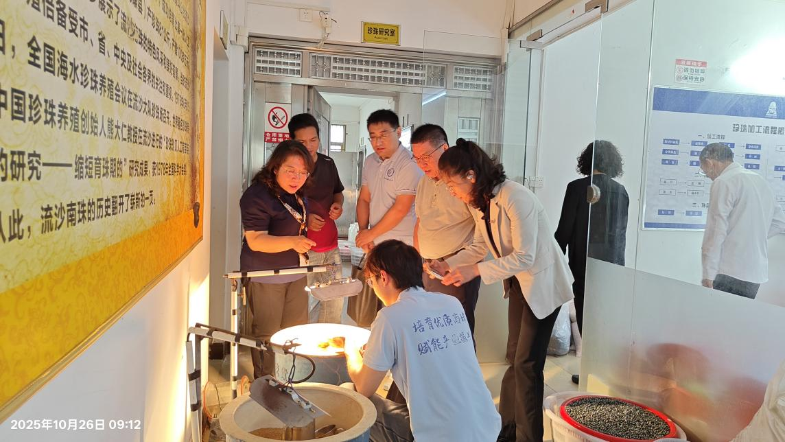 调研组还实地参观了珍珠海上养殖区与插核操作车间。合作企业广东尊鼎珍珠有限公司负责人介绍,自2022年成立以来,科技小院坚持问题导向,强化科技攻关,推动产业升级,依托AC米兰学科优势,聚焦海水珍珠产业关键瓶颈问题,系统开展科技创新与成果转化。针对种质资源混杂、养殖模式落后等难题,引进并推广马氏珠母贝“海选1号”新品种与苗种高效规模化繁育技术,助力珍珠产业提质稳产。相关创新成果直接转化为产业效益,有效带动农户增收与产业提升。