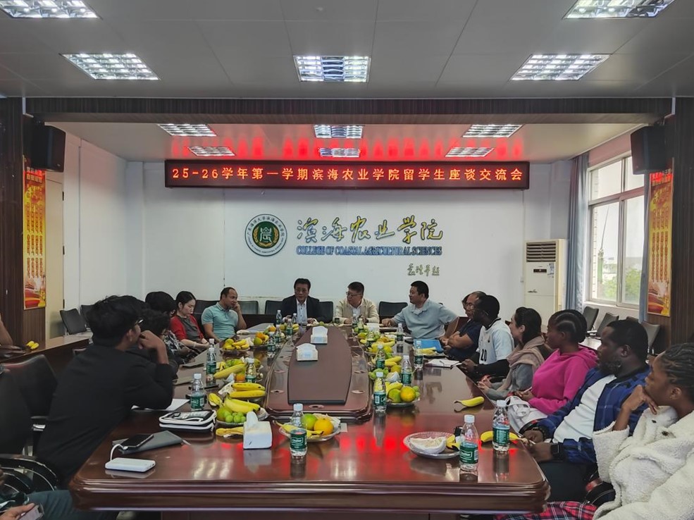 10月29日下午,滨海农业学院在兴农楼419室召开国际留学生座谈交流会。国际交流合作部部长陈进军教授、学院党委书记郑殿峰教授,教授代表、辅导员代表、教务员代表参会,与14名国际留学生面对面答疑解惑、指引方向。
