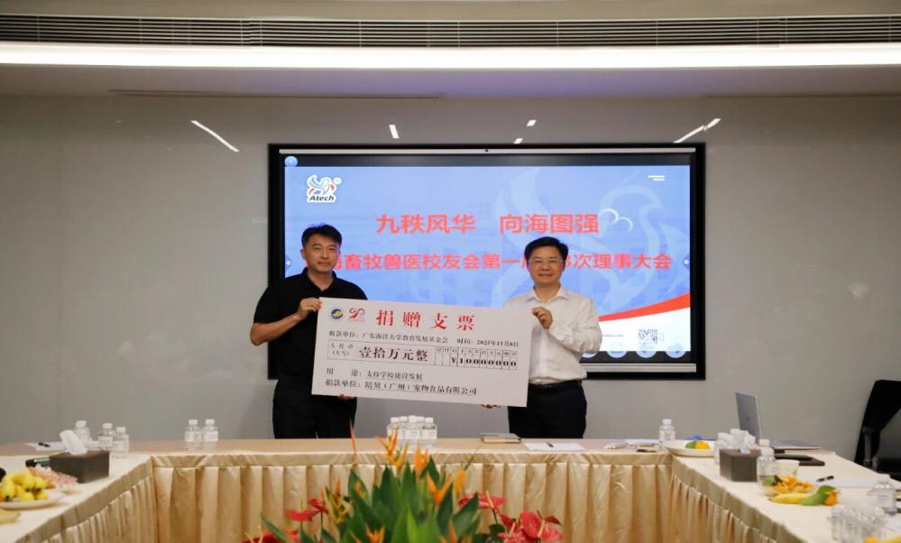 许德贤理事在大会现场向学院捐赠人民币10万元并表示,海大的培养让其有能力在行业立足,此次回馈母校,希望能助力更多学弟学妹深耕动物健康食品赛道,为产业输送更多专业人才。马驿代表学院接受捐赠,并对畜牧兽医校友会长期以来对学院建设的关注与支持致以诚挚谢意。他表示,畜牧兽医校友会架起了校友与母校、企业与行业的桥梁,校友们用行动为行业发展注入了力量,让海大的名片愈发鲜亮。希望校友们将这种互帮互助、服务行业、回馈社会的精神传承给师弟师妹们,让海大畜牧兽医人的初心与担当在薪火相传中愈发坚定。