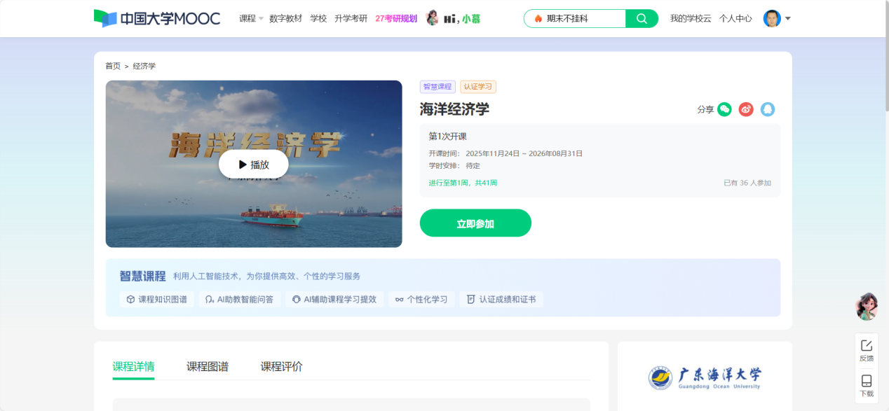 11月24日,经济学院《海洋经济学》课程在中国大学MOOC(慕课)平台正式上线。该课程不仅是学校首批登陆该平台的课程之一,也是学校首门以“智慧课程”形态上线的课程。