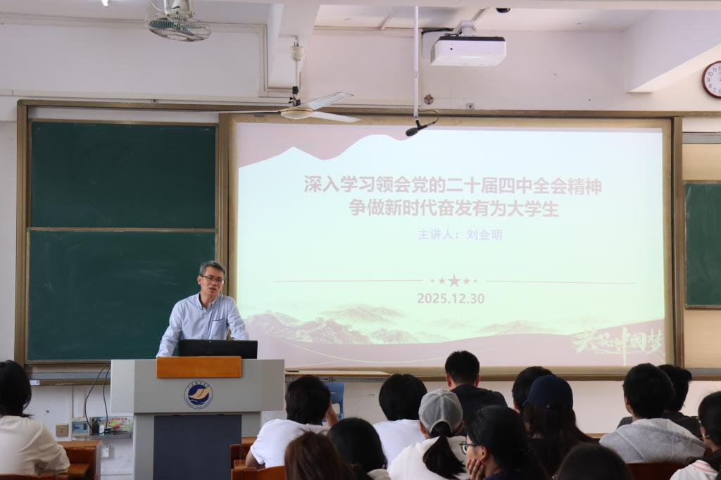 12月30日下午,经济学院党委书记刘金明以《深入学习领会党的二十届四中全会精神,争做新时代奋发有为大学生》为题,在湖光校区明德楼B1201教室为120多名学生干部和学生党员讲授思政课。经济学院全体专职学工人员参加活动。