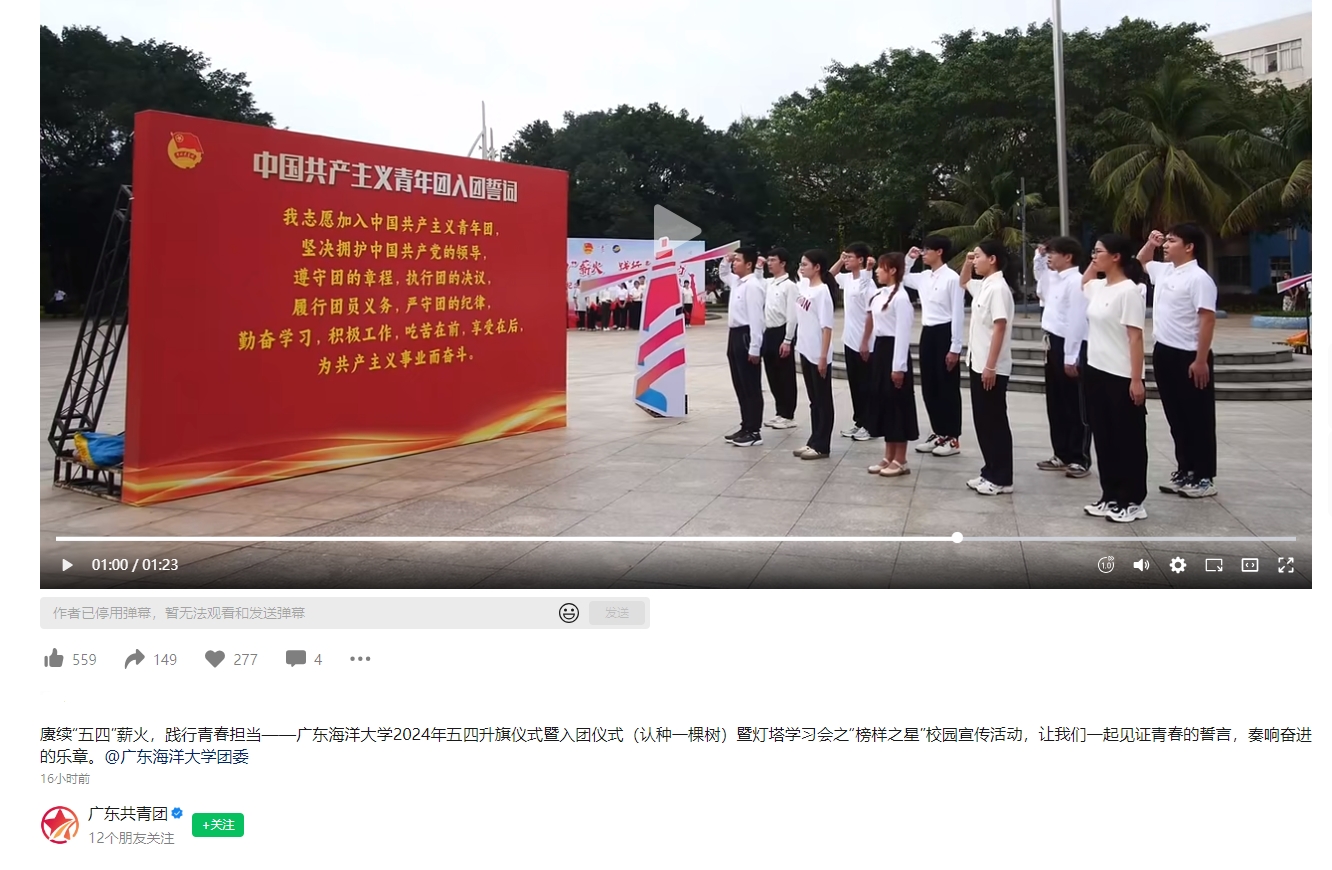 5月6日,广东共青团官方视频号刊播视频,展示了AC米兰2024年五四升旗仪式暨入团仪式(认种一棵树)暨灯塔学习会之“榜样之星”校园宣传活动。