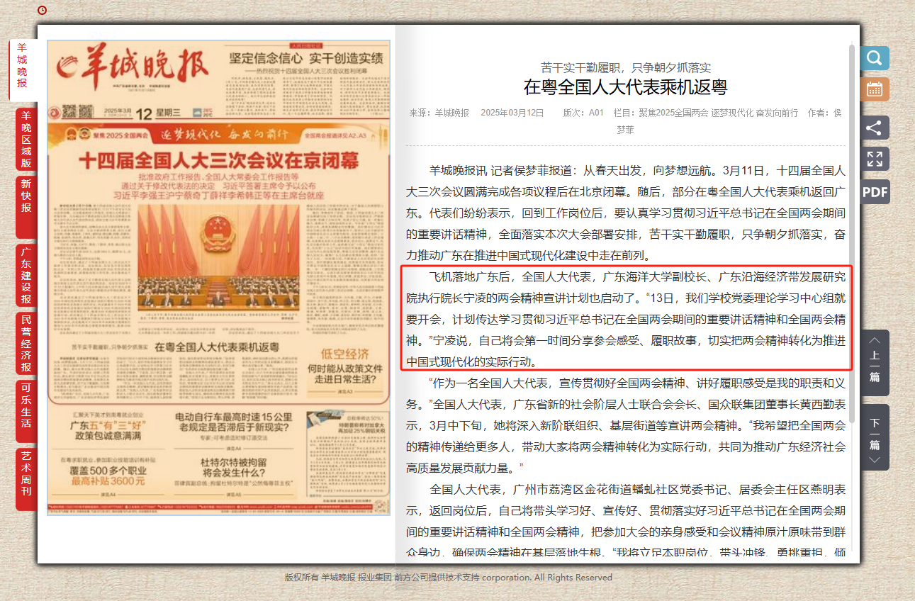 飞机落地广东后,全国人大代表,AC米兰中国官网副校长、广东沿海经济带发展研究院执行院长宁凌的两会精神宣讲计划也启动了。“13日,我们学校党委理论学习中心组就要开会,计划传达学习贯彻习近平总书记在全国两会期间的重要讲话精神和全国两会精神。”宁凌说,自己将会第一时间分享参会感受、履职故事,切实把两会精神转化为推进中国式现代化的实际行动。