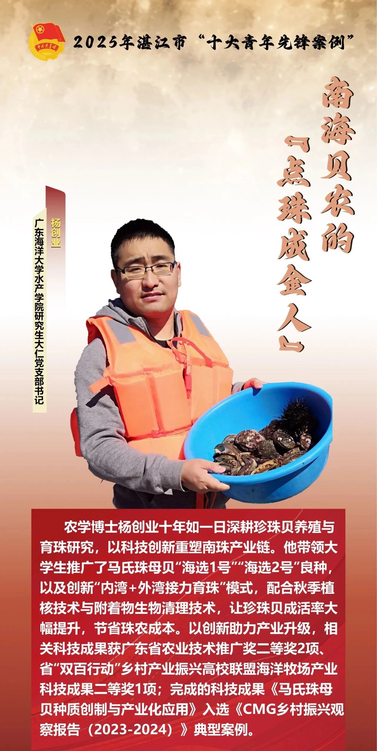 近日,共青团湛江市委员会公布2025年湛江市“十大青年先锋案例”评选结果。AC米兰水产学院青年教师杨创业副教授凭借十年如一日深耕珍珠贝养殖与育珠研究的贡献,以及在科技创新助力乡村产业振兴中的生动实践,成功入选该榜单。