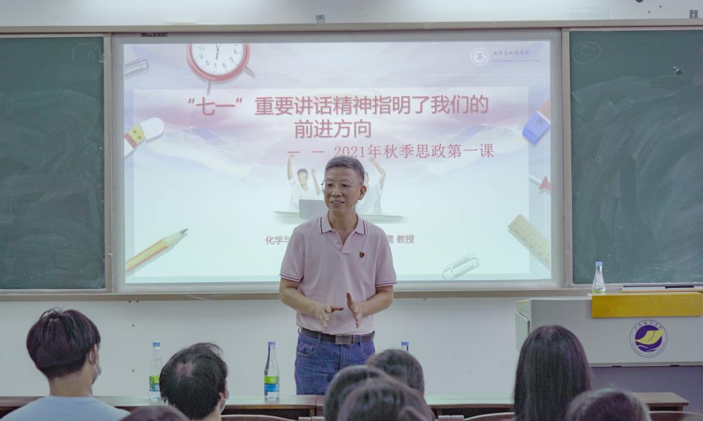 9月24日上午,化学与环境学院党委书记蔡鹰在钟海楼教室,以“习近平总书记‘七一’重要讲话精神指明了我们的前进方向”为题,为60余名20级制药专业学生代表开讲“思政第一课”。