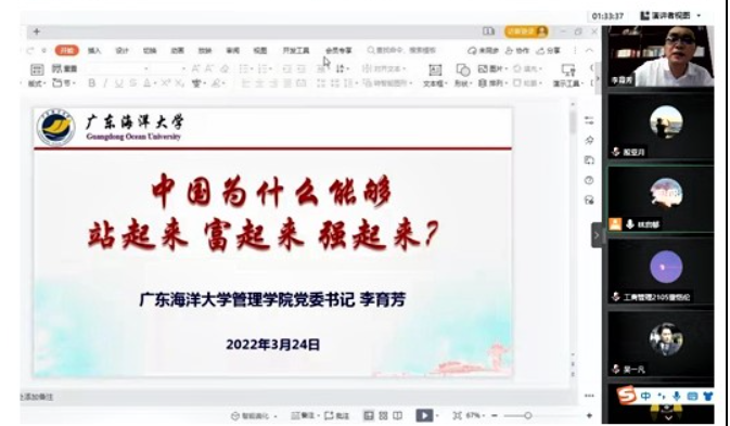 按照学校党委部署,管理学院党委书记、院长于39日和324线上开讲2022年春季学期 “思政第一课”,教育引导青年学生通过党的百年奋斗史,进一步加深对党初心使命的理解和认识,坚持德智体美劳全面发展,努力成长为堪担大任的新时代栋梁之才。共有580多名学生党员、预备党员、入党积极分子和研究生、本科生在线上课。