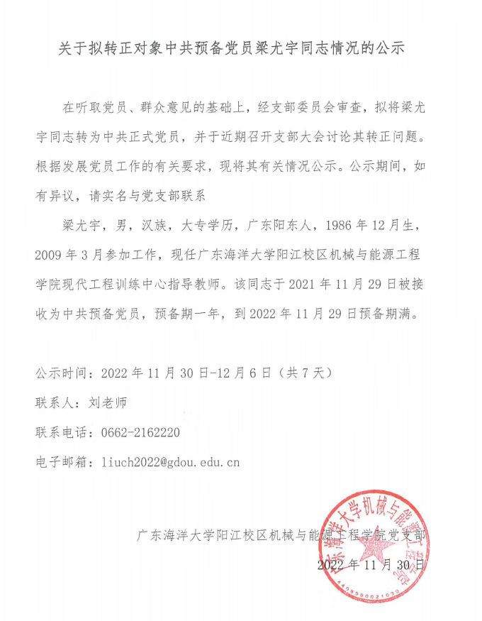 关于拟转正对象中共预备党员梁尤宇同志情况的公示