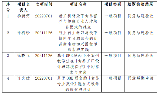 根据《AC米兰中国官网教育教学改革项目管理办法》(校教务〔2020〕28号)和《关于做好2024年度校级教育教学改革项目结题验收工作的通知》的相关规定,食品科学与工程学院组织开展了2024年度校级教育教学改革项目结题验收工作。学院共收到3份项目结题验收材料和1份项目延期申请材料,随后组织专家评审通过,并经学院党政联席会议审定通过,现将食品科学与工程学院2024年度校级教育教学改革项目结题验收结果予以公示。具体如下: