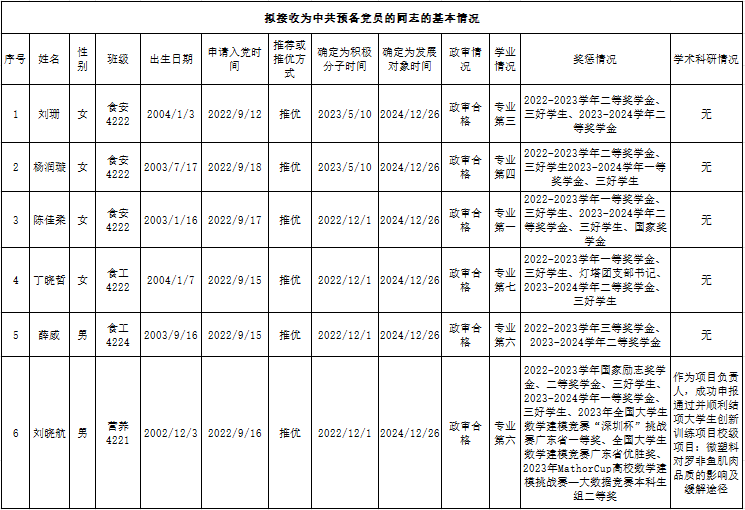 根据《AC米兰中国官网发展党员工作实施细则》规定,经本人提出申请,党组织培养考察,支部党员大会审查研究决定,经党总支预审通过,拟接收刘珊、杨润璇、陈佳柔、丁晓哲、薛威、刘晓航6位同志为中共预备党员。现将其有关情况予以公示,征求党员、群众意见。