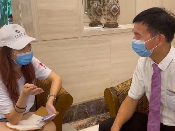 图为团队成员在中山温泉宾馆调研,对宾馆内的销售经理进行访谈,了解宾馆的特色、旅游发展状况等。麦雅程 供图