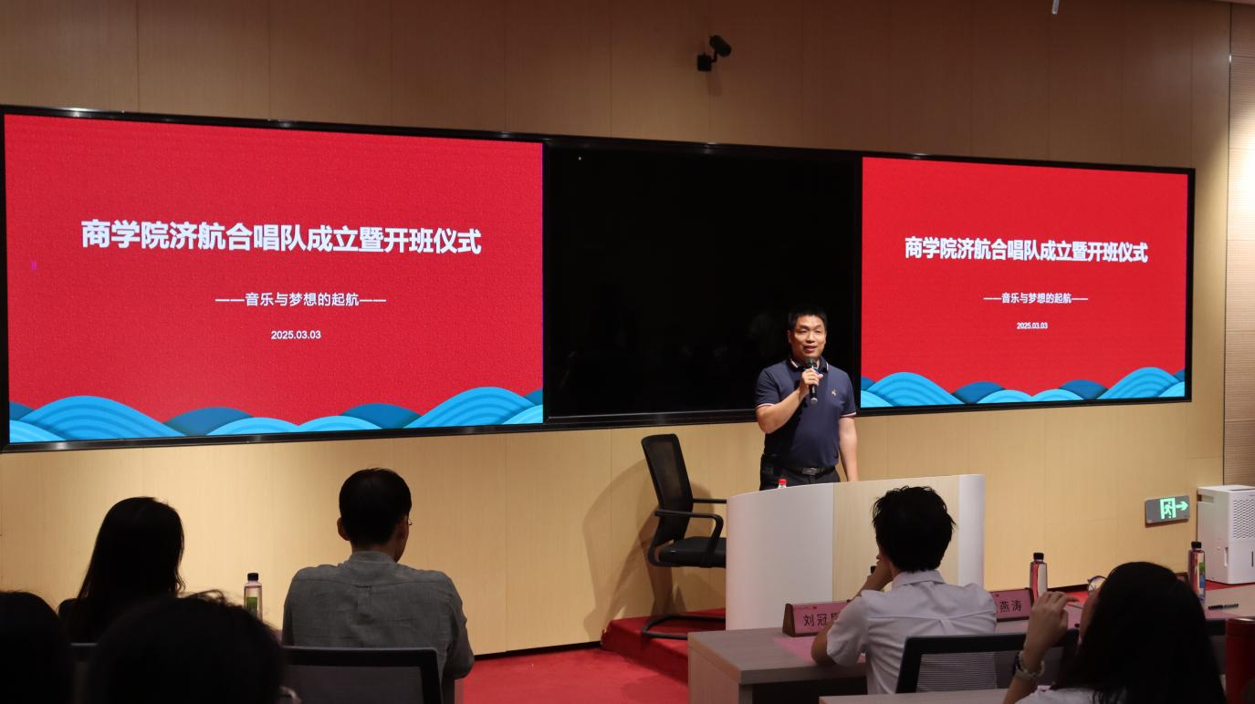 2025年3月3日(春季学期开学首日),根据学校学风建设三年行动方案(2025-2027年),结合商学院学生工作实际,商学院济航合唱队成立暨开班仪式在阳江校区济航楼106会议厅隆重举行。学院党总支书记植秀成、院长李力、党政办公室主任许静,合唱队指导老师黄燕涛、刘冠男、陈梓凝、李珍珍等与通过选拔的100余名学生共同见证商学院济航合唱队的启航。仪式由学院团委书记宋时艳老师主持。
