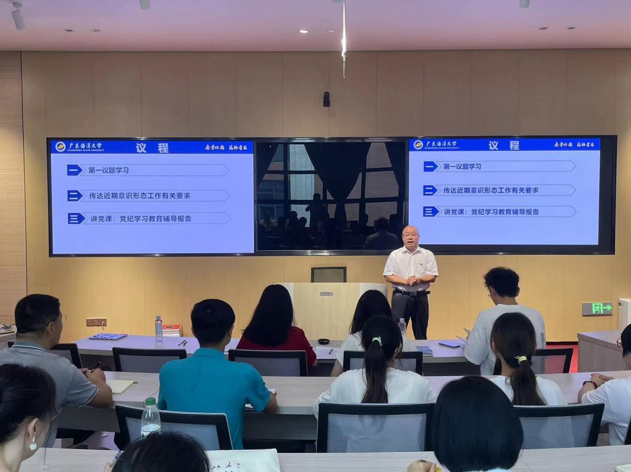 第一大部分内容共有三项议程:一是第一议题学习,二是传达近期意识形态工作有关要求,三是书记讲党课:党纪学习教育辅导报告。首先,植秀成同志领学了习近平对学校思政课建设作出重要指示,强调党的十八大以来,党中央始终坚持把学校思政课建设放在教育工作的重要位置,党对思政课建设的领导全面加强,各级各类学校社会主义办学方向更加鲜明,思政课教师乐教善教、潜心育人的信心底气更足,广大青少年学生“四个自信”明显增强、精神面貌奋发昂扬,思政课发展环境和整体生态发生全局性、根本性转变。接着,植秀成同志传达近期意识形态工作有关要求和进行书记讲党课——党纪学习教育辅导报告。