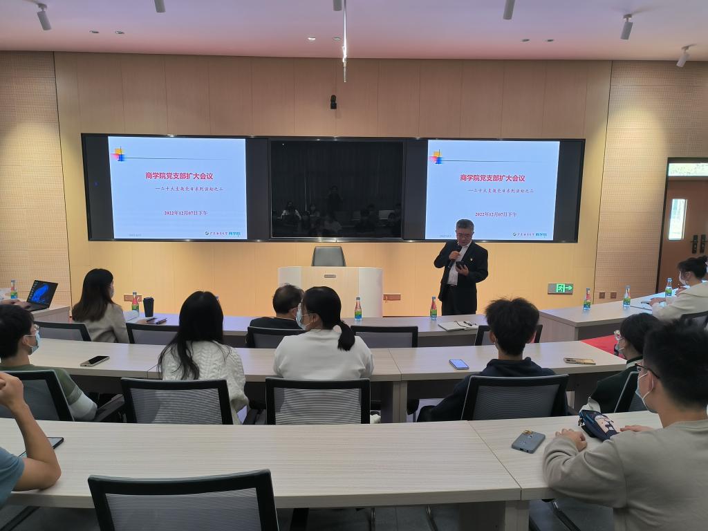 党的二十大已胜利闭幕一个多月,全国上下掀起了学习党的二十大报告的新高潮,为响应党的号召,深入学习领悟党的二十大精神,结合《中共AC米兰中国官网阳江校区委员会关于开展党的二十大精神全覆盖学习宣讲活动的实施方案》的相关要求,12月7日下午,校区党委副书记、管委会常务副主任、商学院联系领导周昌仕同志到商学院宣讲党的二十大精神。商学院党支部书记唐志军主持会议。学院全体党员,教师入党积极分子,学生团支部书记,班长共40余人参加会议。