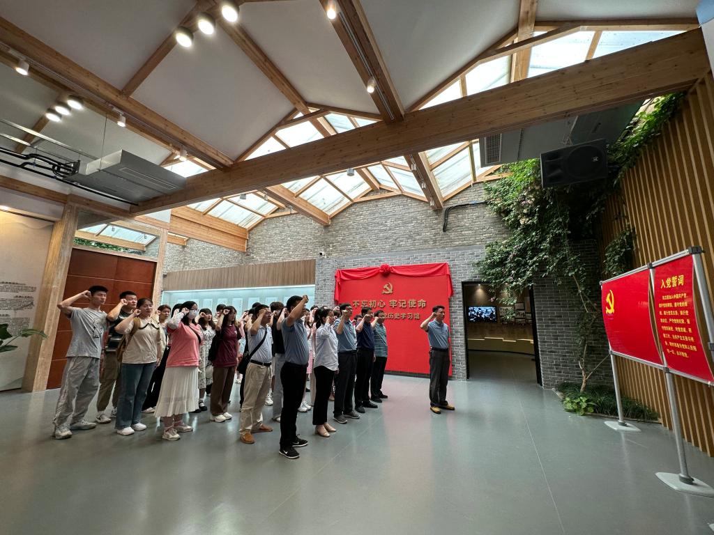 参观前,全体党员在学院党委书记詹学文的带领下,面向党旗集体重温入党誓词。