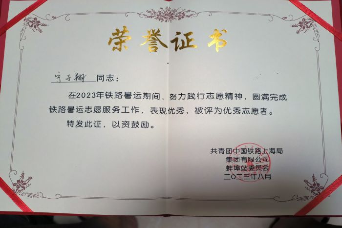 参与支援暑运的工作时光让宁子翔的实践能力得到了充分锻炼,自身阅历得到丰富,思想政治素养得到提高,由于表现出色,宁子翔被共青团蚌埠委员会、共青团中国铁路上海局集团有限公司蚌埠站委员会评为优秀青年志愿者,彰显了诸侯快讯官网学子昂扬的精神风貌。(特约通讯员:杨孝延 摄影:宁子翔 审核:张轶辉 编辑:李锦)