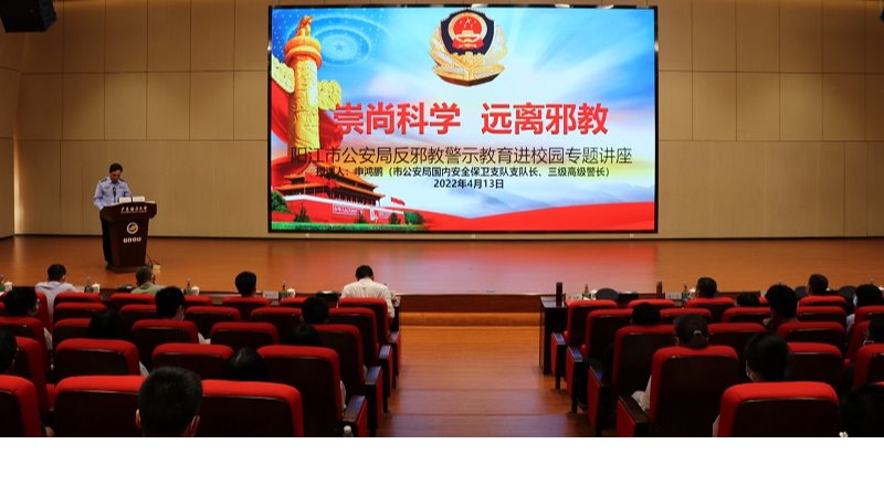 4月13日下午,校区联合阳江市公安局在校园开展“4·15”国家安全日普法宣传暨反邪教知识宣传活动,深入学习贯彻习近平法治思想,提高校区师生的国家安全法治意识和反邪教意识,树牢总体国家安全观,感悟新时代国家安全成就,为迎接党的二十大胜利召开营造良好氛围。活动首先邀请了阳江市公安局三级高级警长申鸿鹏在海纳楼113报告厅作主题为“崇尚科学、远离邪教”的反邪教警示教育进校园专题讲座。讲座上,申鸿鹏通过典型案例讲...