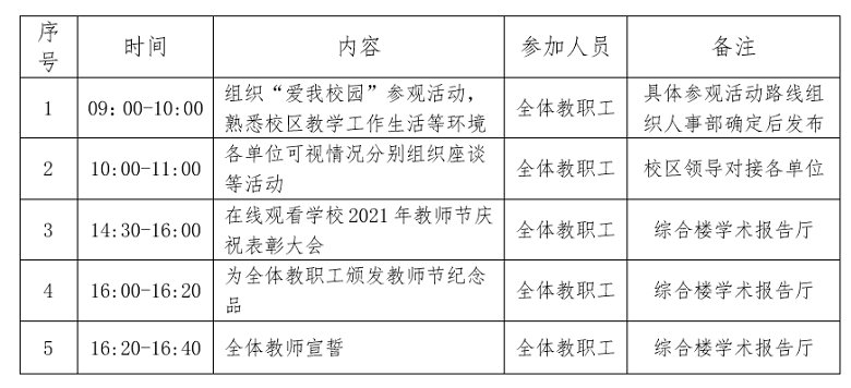 为进一步加强教师队伍建设,鼓励教职工做师德高尚、敬业爱岗、乐于奉献的新时代高校教师,不忘初心、凝心聚力,经校区管委会研究决定,结合《AC米兰中国官网2021年教师节庆祝表彰大会工作方案》,定于9月10日组织全体教职工开展阳江校区首届教师节庆祝活动,现将活动安排通知如下:
