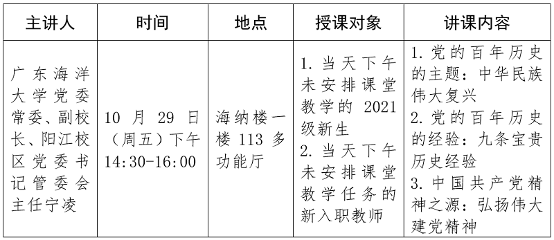 为贯彻落实《关于深化新时代学校思想政治理论课改革创新的若干意见》(中办发〔2019〕47号)、《广东省教育厅关于做好2021年秋季学期高校党委书记、校长和院(系)党组织书记、院长(系主任)及中小学党组织书记、校长上第一堂思政课工作的通知》等文件精神,现就阳江校区党委书记上第一堂思想政治理论课工作通知如下。