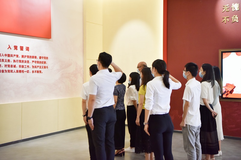 在解说员的带领下,全体党员参观了边海红色展馆展示区域,重温红色历史,了解“边海红旗精神”。在入党誓词展示墙前,许浩同志担任领誓人,全体党员举起右拳,一同重温入党誓词。