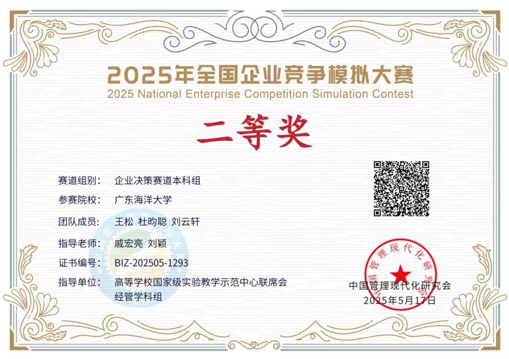 近日,由中国管理现代化研究会决策模拟专业委员会主办的2025年全国企业竞争模拟大赛圆满结束。全国企业竞争模拟大赛是面向高校大学生的具有中国特色的重要商业模拟竞赛,是中国高等教育学会发布的《全国普通高校大学生竞赛分析报告》竞赛项目之一,本届大赛自3月初启动,共计688所高校9091支队伍报名参赛。商学院由戚宏亮教授和刘颖副教授担任指导教师的两支代表队,经过全国复赛、全国半决赛的层层筛选,最终获得全国二等奖、三等奖。此次获奖是商学院专业学习、科学实验、实训实习和创新实践一体化改革成果的重要体现。不仅提升了学生的实践创新能力,也推动了教师教学水平进阶,为学校教学高质量发展注入新动能。