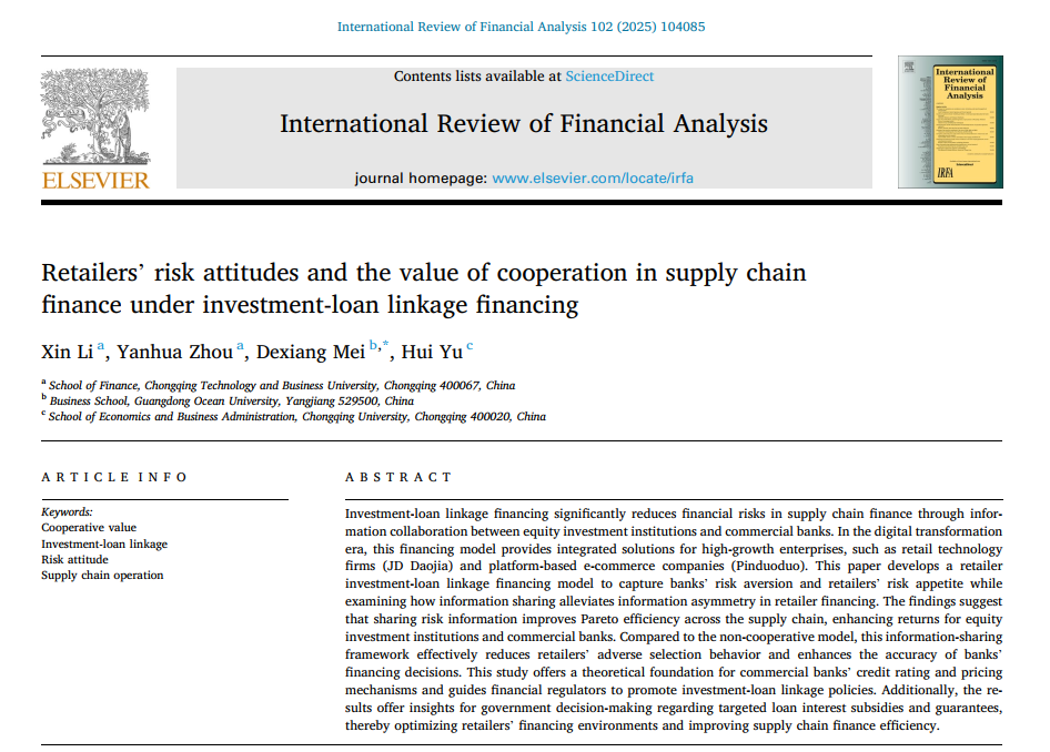 梅德祥等的论文构建了零售商投资-贷款联动融资模型来分析银行的风险规避与零售商的风险偏好,并探讨了信息共享如何缓解零售融资中的信息不对称。该论文研究发现,风险信息共享可提升供应链的帕累托效率,提高股权投资机构与商业银行的收益,同时减少零售商的逆向选择行为,提升银行融资决策的准确性。该项研究为商业银行信用评级与定价机制提供了理论支持;可为监管机构优化投资-贷款联动政策、政府制定定向贷款利息补贴与担保策略提供决策参考,从而提升供应链金融效率。