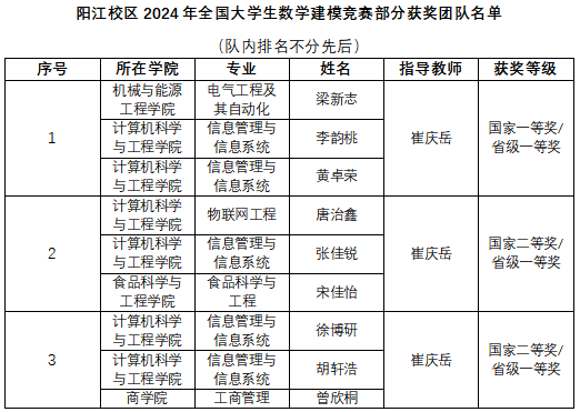 11月8日,根据全国大学生数学建模竞赛组委会发布消息,阳江校区学子在2024年“高教社杯”全国大学生数学建模竞赛中荣获全国一等奖1项、全国二等奖4项、省级一等奖13项、省级二等奖15项、省级三等奖4项。